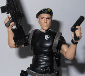 Ataviado con boina perfectamente colocada el soldado tiene una aspecto imbatible, nunca dejaré de sostener que se trata de una prenda que favorece enormemente a los Joes, y además está adornada con el escudo de esa fuerza militar. El resto del uniforme es sencillo pero sobrio y perfectamente diseñado. Una camiseta negra entallada, también con el escudo de G.I. Joe en el pecho, un cinturón con útil cartuchera, pantalones de camuflaje azules con manchas grises y botas militares negras.