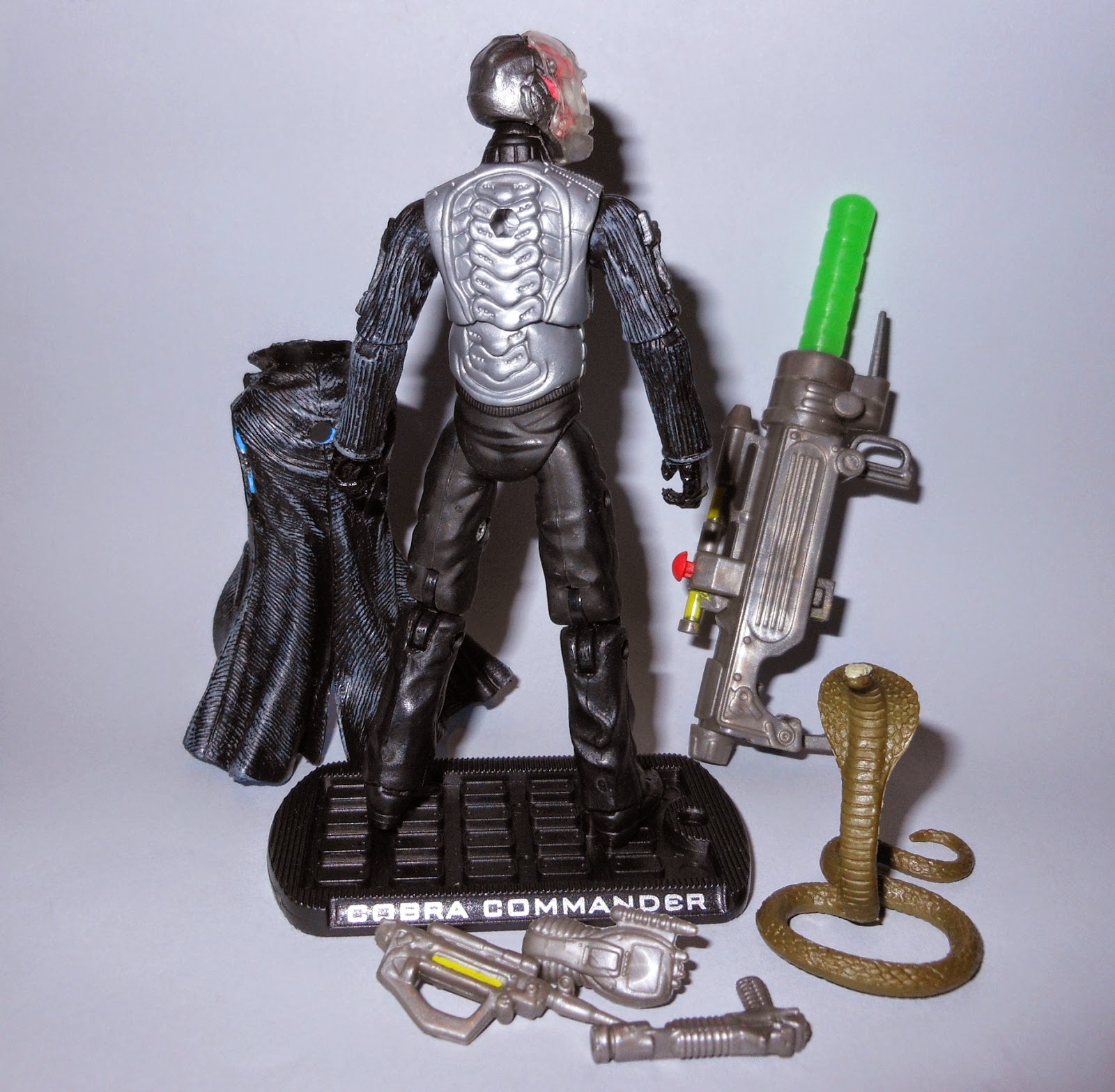 La colección de The Rise Of Cobra combinaba estupendas figuras de acción en cuanto a técnica y diseño que eran nuevas versiones, adaptadas a lo aparecido en la primera película de imagen real de la licencia, discutibles en ocasiones. No creo que en ningún caso ninguno de esos personajes en su versión cinematográfica pudiera batir las clásicas versiones de los miembros de G.I. Joe y de Cobra de la línea de figuras de acción, de los cómics y de los dibujos animados.Y extraído de esa película tenemos a este extraño Comandante Cobra pero que, por otra parte, es una muy buena figura de acción. Y también extrañamente encaja con mucho de los personajes de las filas de Cobra pero más que como un nuevo Comandante Cobra parece algo así como un científico loco y deformado a las órdenes de la maligna organización terrorista.