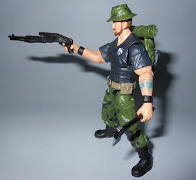 Sus accesorios denotan ese paso de especialista en ametralladoras pesadas a un soldado de infantería que parece ejercer funciones de zapador; un hacha y la motosierra parecen destinadas a realizar trabajos de acondicionamiento de campos de batalla o de caminos por los que transitan las tropas. Además de ellos, el sombrero con el mismo patrón de camuflaje que los pantalones, la mochila, una escopeta, el soporte personalizado y un ridículo lanzamisiles (que por cierto he puesto en venta junto a otros juguetes parecidos de Rise Of Cobra) completan su equipamiento.